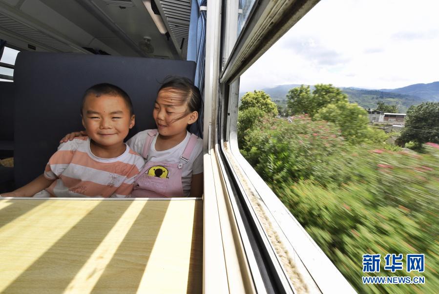 2020年8月14日,吳思語(yǔ)(右)帶著弟弟吳思遠(yuǎn)乘坐“小慢車”前往西昌走親戚。穿越四川涼山彝族自治州往返于普雄和攀枝花之間的5633/5634次列車,全列13節(jié)車廂,走滿全程353公里需要9個(gè)多小時(shí)。慢悠悠的火車沿途要停靠26個(gè)站,如同一座流動(dòng)的村莊,盡自己最大能力解決沿途百姓出行問題。