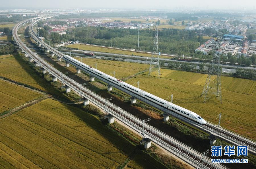 2020年10月10日,一列動車組列車行駛在江蘇連云港市境內(nèi)(無人機照片)。