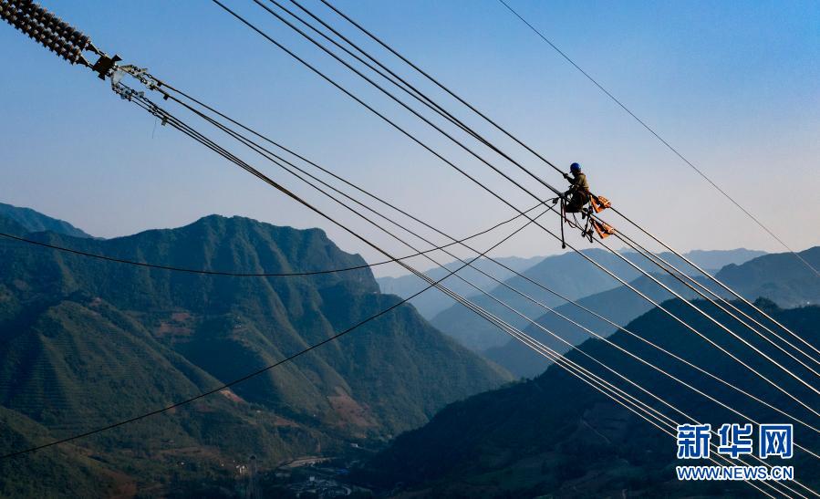 2020年5月3日,施工方國網(wǎng)四川電力送變電建設(shè)有限公司的員工在秦嶺之巔的高空緊線(無人機照片)。