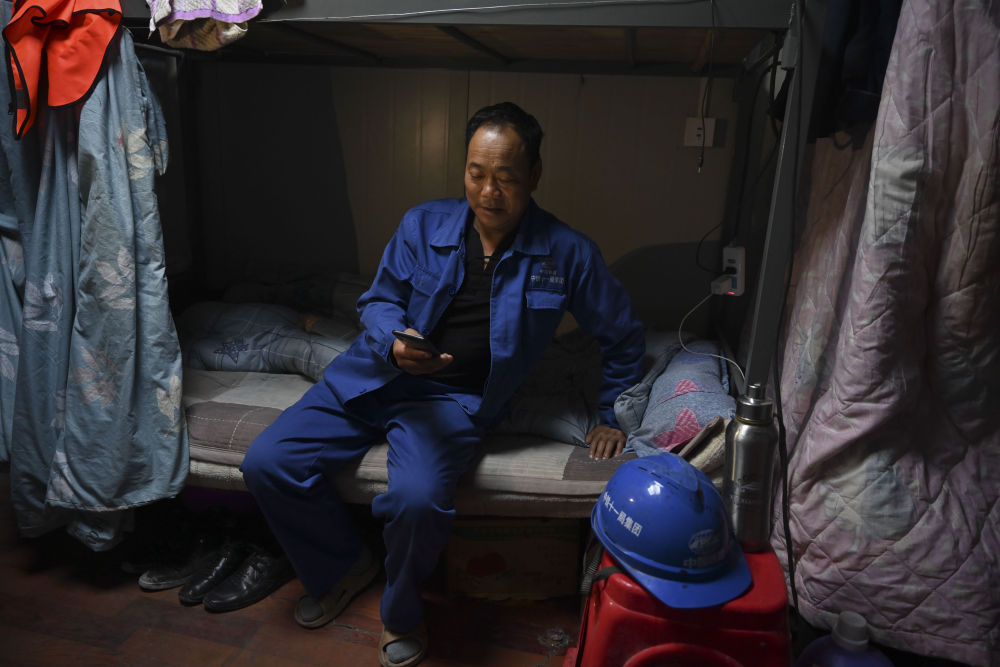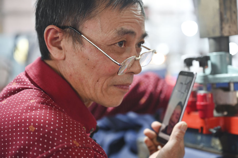 1月25日,在福建省福州市閩侯縣的億格戶(hù)外用品有限公司生產(chǎn)車(chē)間,四川籍計(jì)件工人張良國(guó)在休息時(shí)與大兒子視頻通話。