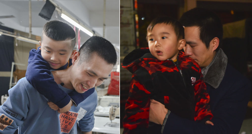 左圖為2021年1月26日,在福建省石獅市的金利萊斯服裝廠,聰聰和黃海龍?jiān)谝黄?;右圖為2018年2月2日凌晨,黃海龍即將登上返回四川的長(zhǎng)途車(chē),在上車(chē)前抱著不滿(mǎn)3歲的聰聰難舍難分。