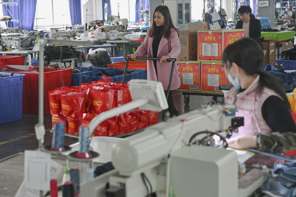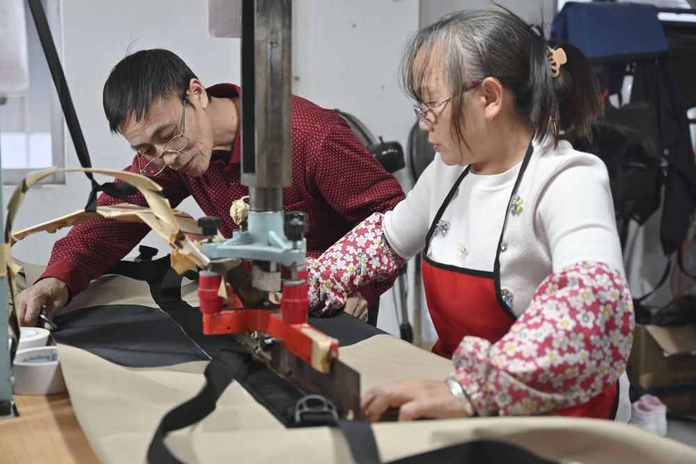 1月25日,張良國(guó)和妻子黃遠(yuǎn)玲一起加工防水包。
