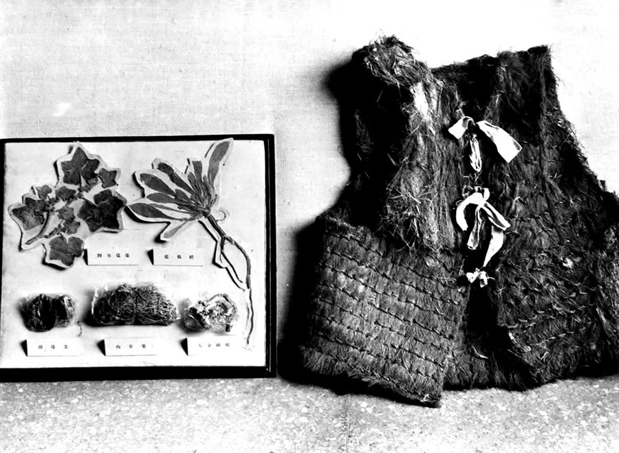 紅軍長征時吃過的野菜的標(biāo)本(左)和穿過的棕背心 新華社圖片