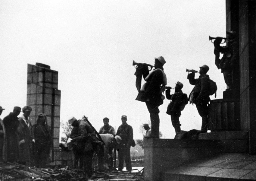 遼沈戰(zhàn)役我司號(hào)員吹響勝利的號(hào)角。 新華社圖片