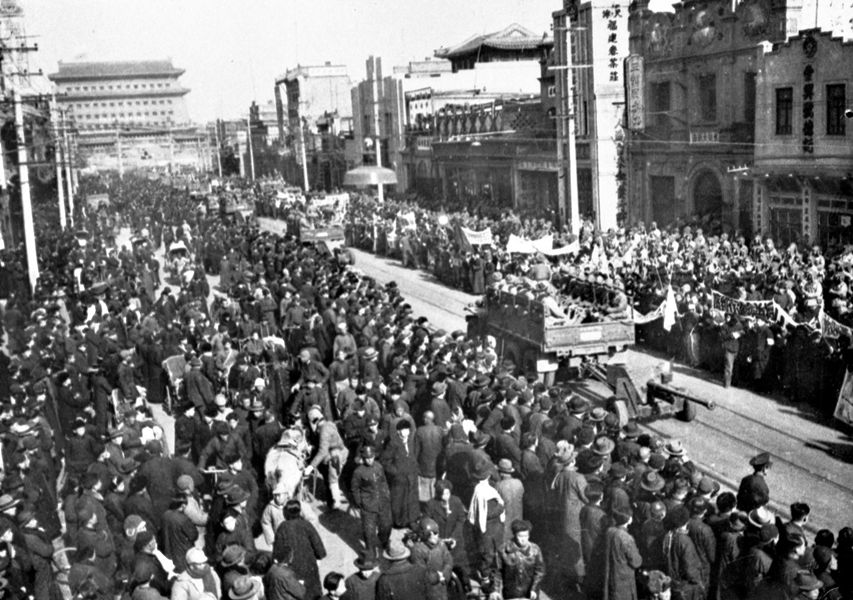 北平市民在正陽(yáng)門(mén)大街上夾道歡迎參加入城式的人民解放軍。 新華社圖片