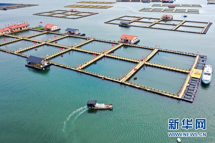 漁船駛過福建省寧德市三都澳大黃魚深水塑膠漁排養(yǎng)殖區(qū)(無人機照片,2020年7月15日攝)。新華社記者姜克紅攝