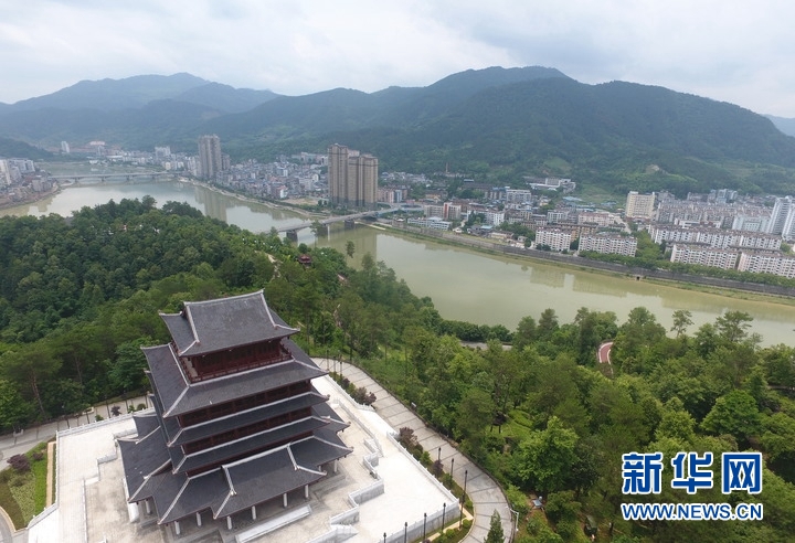 南平市順昌縣金溪和富屯溪兩溪交匯的觀靜山上的順昌閣和順昌縣城一角(無人機照片)。新華社記者林善傳攝
