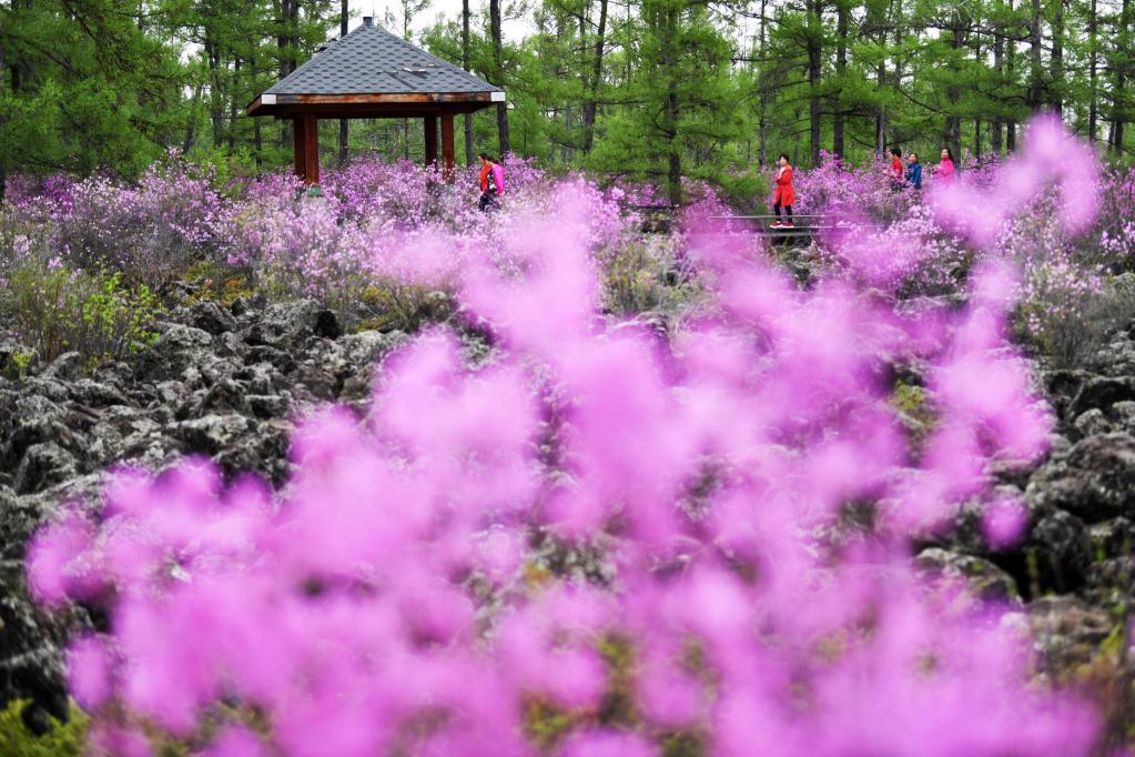 游客在伊春紅星火山地質(zhì)公園欣賞杜鵑花(2019年5月13日攝)。新華社記者王建威攝