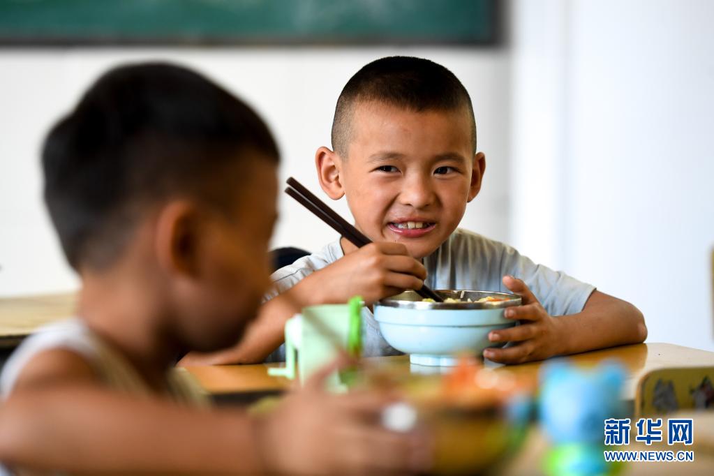 湖南省湘西土家族苗族自治州花垣縣十八洞小學的學生在教室吃午飯(2019年9月5日攝)。新華社記者 陳澤國 攝