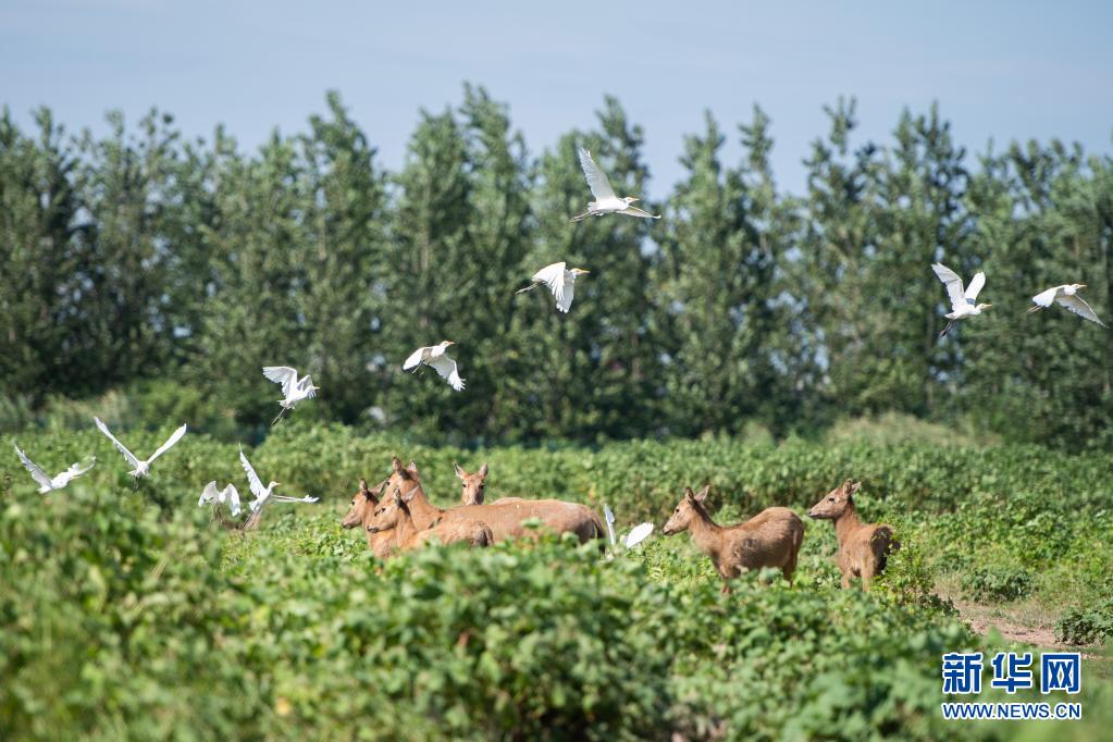 這是2020年8月7日在湖南岳陽東洞庭湖麋鹿和鳥類救治避難中心拍攝的麋鹿和飛鳥。新華社記者 陳思汗 攝