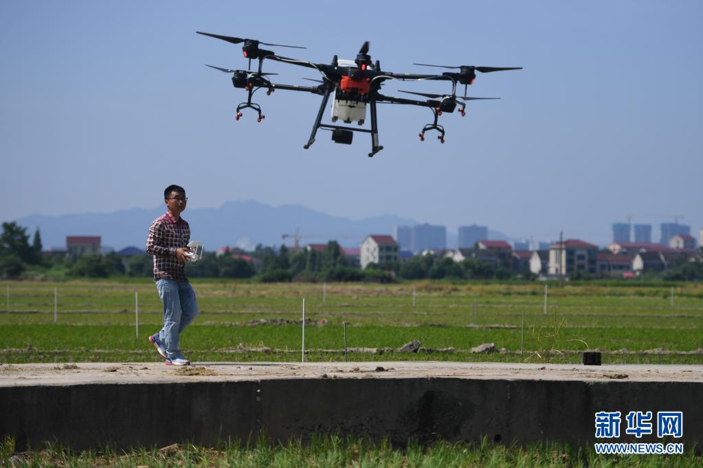 工作人員在湖南省益陽市赫山區(qū)米香村的稻田旁操控無人機給晚稻打藥(2020年7月23日攝)。新華社記者 薛宇舸 攝