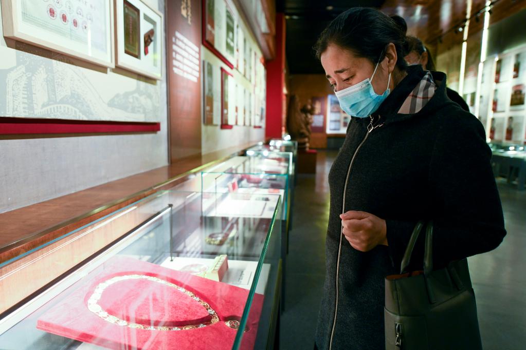2021年4月3日,在烏魯木齊市革命烈士陵園,瑪依努爾看著愛人艾熱提的獎(jiǎng)?wù)孪萑肷钏?。新華社記者 王菲 攝