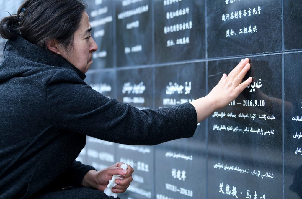 2021年4月3日,在烏魯木齊市革命烈士陵園,瑪依努爾撫摸鐫刻在新疆公安英烈紀(jì)念碑上愛人艾熱提的名字。新華社記者 王菲 攝