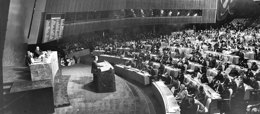 1971年9月,第二十六屆聯(lián)合國(guó)大會(huì)召開(kāi)。從10月18日開(kāi)始,聯(lián)合國(guó)大會(huì)就恢復(fù)中華人民共和國(guó)在聯(lián)合國(guó)的代表權(quán)問(wèn)題進(jìn)行了一周的激烈辯論。10月25日,第二十六屆聯(lián)合國(guó)大會(huì)表決剛一結(jié)束,紐約聯(lián)合國(guó)會(huì)議大廳里立刻一片沸騰,雷鳴般的掌聲和歡呼聲一浪高過(guò)一浪,此起彼伏,經(jīng)久不息。新聞媒介評(píng)論道:“中國(guó)是在自己不在場(chǎng)的情況下,受到聯(lián)大三分之二以上國(guó)家的祝福,使聯(lián)合國(guó)發(fā)生根本變化?!?/p>