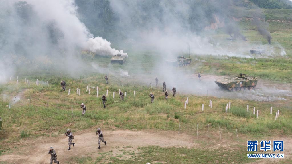 對(duì)抗演練中,陸軍第83集團(tuán)軍某旅“紅一連”官兵突破“敵”陣地前沿(無人機(jī)照片,7月4日攝)。新華社發(fā)(姜東坡攝)