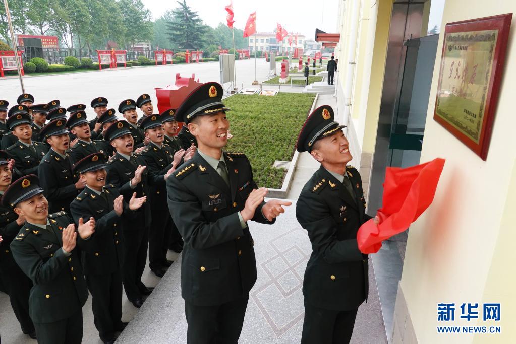 陸軍第83集團(tuán)軍某旅“紅一連”官兵在連隊(duì)門前懸掛“星火燎原”育人基地牌匾(4月23日攝)。新華社記者 張永進(jìn) 攝
