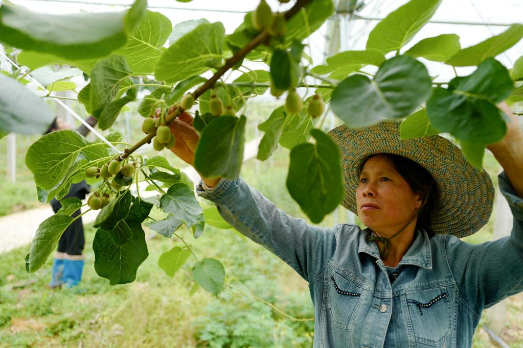 圖為長(zhǎng)坪村村民在獼猴桃種植大棚內(nèi)進(jìn)行疏果作業(yè)。(新華社記者劉潺 攝)