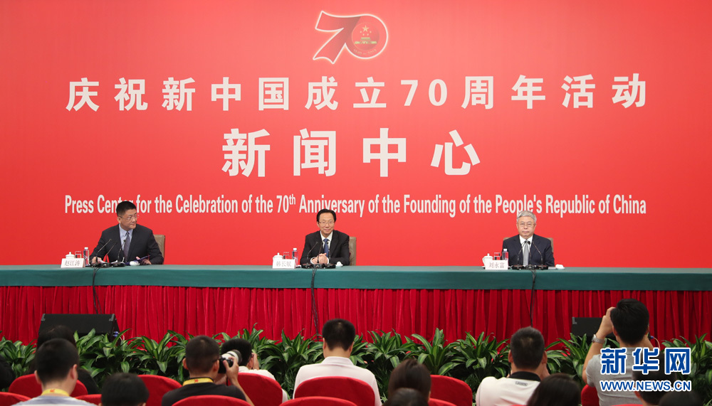 9月27日,慶祝中華人民共和國成立70周年活動(dòng)新聞中心在梅地亞中心二層新聞發(fā)布廳舉辦第三場(chǎng)新聞發(fā)布會(huì),中央農(nóng)村工作領(lǐng)導(dǎo)小組辦公室主任、農(nóng)業(yè)農(nóng)村部部長韓長賦,國務(wù)院扶貧開發(fā)領(lǐng)導(dǎo)小組辦公室主任劉永富介紹全面建成小康社會(huì),扎實(shí)推進(jìn)脫貧攻堅(jiān)和鄉(xiāng)村振興,并回答記者提問。圖為發(fā)布會(huì)現(xiàn)場(chǎng)。新華網(wǎng) 陳杰 攝