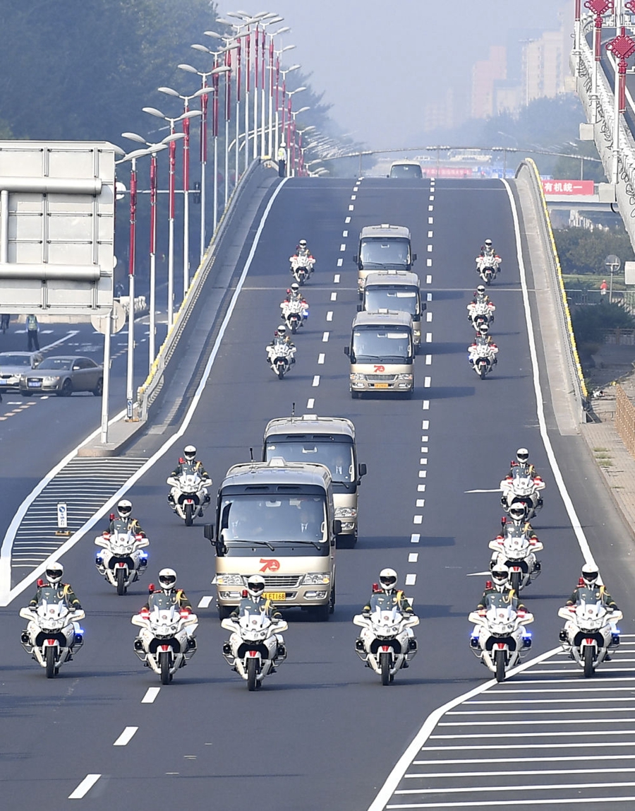 29日上午,國家勛章和國家榮譽(yù)稱號獲得者集體乘坐禮賓車從住地出發(fā),在英姿颯爽的國賓護(hù)衛(wèi)隊(duì)護(hù)衛(wèi)下,匯成一列車隊(duì),向人民大會堂進(jìn)發(fā)。
