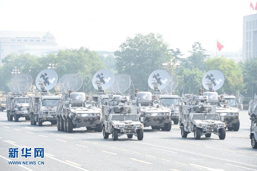 新華社北京10月1日電(記者李國利、李兵峰)身披數(shù)碼城市迷彩、高擎通信天線,由16輛國產(chǎn)新型裝備組成的信息作戰(zhàn)第3方隊,1日上午在孫寶泰少將、景賢舫少將的率領(lǐng)下整齊劃一通過天安門。