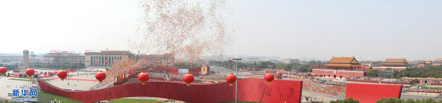 10月1日上午,慶祝中華人民共和國成立70周年大會在北京天安門廣場隆重舉行。這是天安門廣場上放飛氣球(拼接照片)。 新華社記者 金立旺 攝