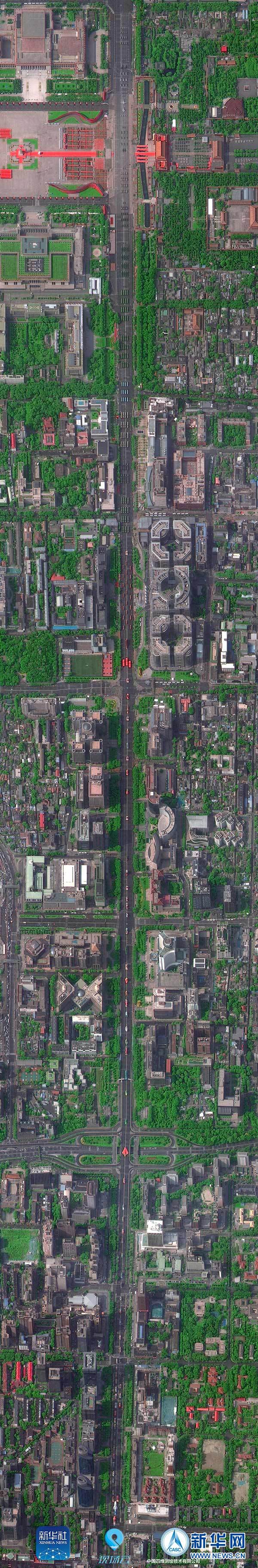 這是“高景1號”拍攝的北京長安街全畫幅衛(wèi)星圖(10月1日攝)。 10月1日上午,慶祝中華人民共和國成立70周年大會(huì)在北京天安門廣場隆重舉行。新華社聯(lián)合多家單位調(diào)用多顆國產(chǎn)衛(wèi)星俯瞰閱兵,從“最高機(jī)位”發(fā)回這三張珍貴的長安街全畫幅衛(wèi)星圖。 新華社發(fā)(中國四維測繪技術(shù)有限公司提供)