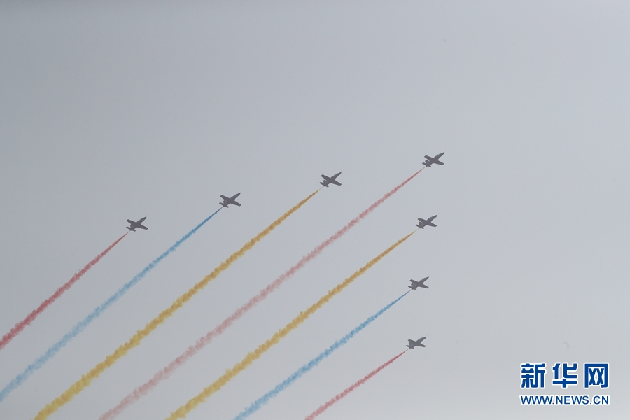 10月1日上午,慶祝中華人民共和國成立70周年大會在北京天安門廣場隆重舉行。這是受閱的空中梯隊(duì)。 新華社記者 王曄 攝