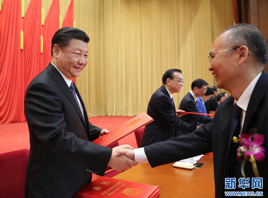 上午10時,大會在雄壯的國歌聲中開始。在熱烈的掌聲中,中共中央總書記、國家主席、中央軍委主席習(xí)近平首先向獲得2017年度國家最高科學(xué)技術(shù)獎的南京理工大學(xué)王澤山院士和中國疾病預(yù)防控制中心病毒病預(yù)防控制所侯云德院士頒發(fā)獎勵證書,并同他們熱情握手,表示祝賀。隨后,習(xí)近平等黨和國家領(lǐng)導(dǎo)人向獲得國家自然科學(xué)獎、國家技術(shù)發(fā)明獎、國家科學(xué)技術(shù)進步獎和中華人民共和國國際科學(xué)技術(shù)合作獎的代表頒獎。