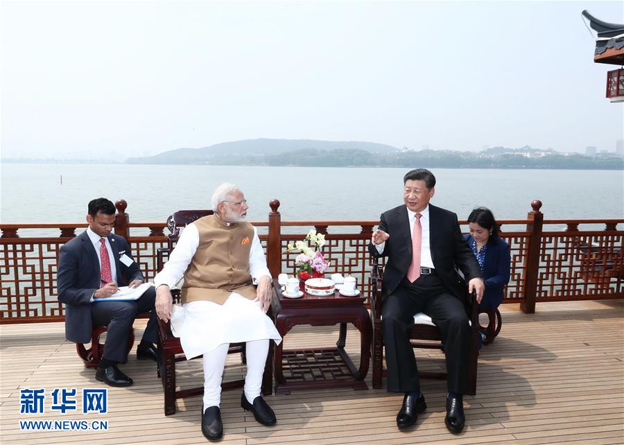 4月27日和28日,國(guó)家主席習(xí)近平在武漢東湖賓館同印度總理莫迪舉行非正式會(huì)晤。這是4月28日,習(xí)近平同莫迪交談。 新華社記者 鞠鵬 攝