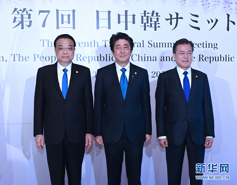 當?shù)貢r間5月9日上午,國務院總理李克強在東京迎賓館同日本首相安倍晉三、韓國總統(tǒng)文在寅共同出席第七次中日韓領導人會議。 新華社記者饒愛民 攝