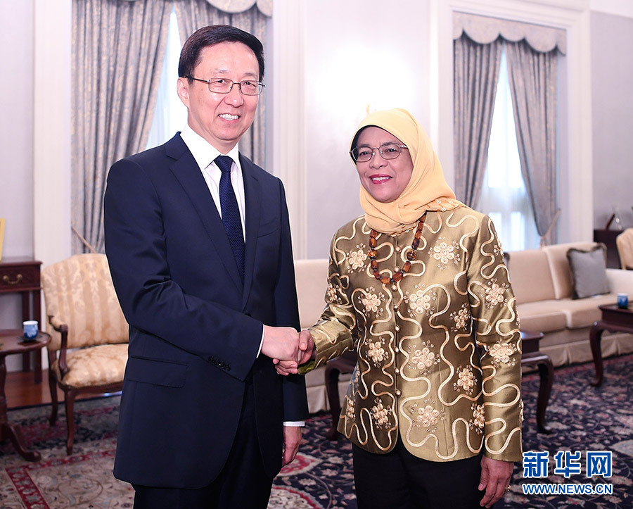 9月19日至21日,中共中央政治局常委、國(guó)務(wù)院副總理韓正應(yīng)邀訪問(wèn)新加坡,分別會(huì)見(jiàn)新加坡總統(tǒng)哈莉瑪、總理李顯龍、副總理張志賢、副總理尚達(dá)曼,并同張志賢共同主持中新雙邊合作聯(lián)委會(huì)第十四次會(huì)議、蘇州工業(yè)園區(qū)聯(lián)合協(xié)調(diào)理事會(huì)第十九次會(huì)議、天津生態(tài)城聯(lián)合協(xié)調(diào)理事會(huì)第十次會(huì)議和中新(重慶)戰(zhàn)略性互聯(lián)互通示范項(xiàng)目聯(lián)合協(xié)調(diào)理事會(huì)第二次會(huì)議。這是9月21日,韓正會(huì)見(jiàn)新加坡總統(tǒng)哈莉瑪。 新華社記者 燕雁 攝