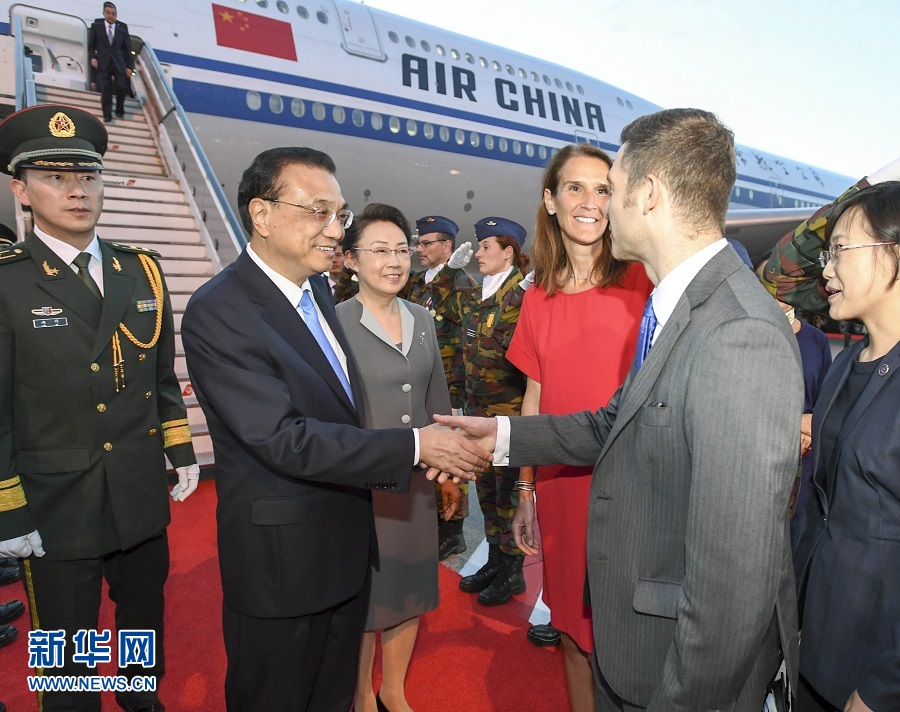 李克強(qiáng)總理夫人程虹,國務(wù)委員兼外交部長王毅,全國政協(xié)副主席、國家發(fā)展和改革委員會主任何立峰等陪同人員同機(jī)抵達(dá)。比利時(shí)政府內(nèi)閣成員到機(jī)場迎接。禮兵沿紅地毯列隊(duì),號手吹號致敬。中國駐歐盟使團(tuán)團(tuán)長張明、中國駐比利時(shí)大使曹忠明等也到機(jī)場迎接。