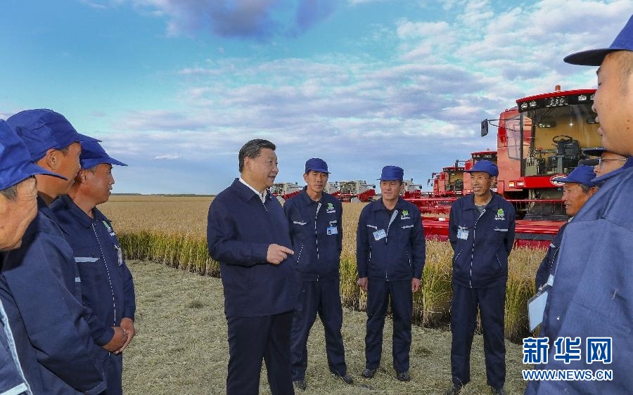 9月25日,習(xí)近平在黑龍江農(nóng)墾建三江管理局七星農(nóng)場萬畝大地號與農(nóng)場工人們親切交談。 新華社記者 謝環(huán)馳 攝