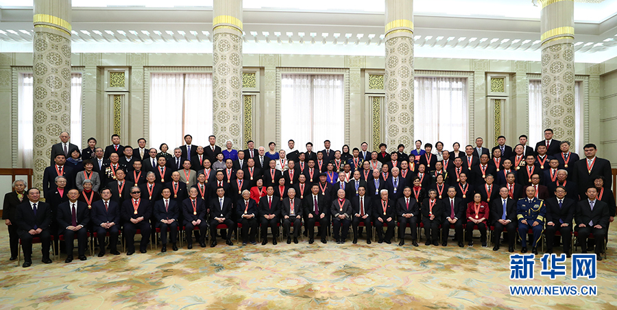 慶祝大會(huì)結(jié)束后,習(xí)近平等會(huì)見(jiàn)了受表彰人員及親屬代表,并同大家合影留念。