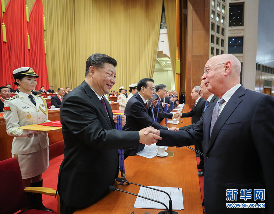 12月18日,慶祝改革開(kāi)放40周年大會(huì)在北京人民大會(huì)堂隆重舉行。中共中央總書(shū)記、國(guó)家主席、中央軍委主席習(xí)近平在大會(huì)上發(fā)表重要講話。這是習(xí)近平等為獲得中國(guó)改革友誼獎(jiǎng)?wù)氯藛T代表頒獎(jiǎng)。 新華社記者 鞠鵬 攝