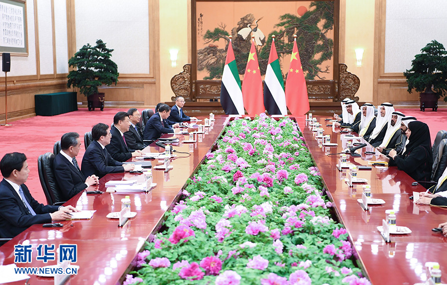 習近平指出,去年7月我訪問阿聯(lián)酋期間,兩國宣布建立全面戰(zhàn)略伙伴關(guān)系,揭開中阿關(guān)系發(fā)展新篇章。中方視阿聯(lián)酋為共建“一帶一路”的重要合作伙伴。雙方要穩(wěn)步推進以能源合作為主軸、以投資和基礎(chǔ)設(shè)施建設(shè)為兩翼、以高新技術(shù)為增長點的務(wù)實合作。下階段要對接創(chuàng)新發(fā)展戰(zhàn)略,打造兩國合作新增長點。要深化打擊恐怖主義和極端勢力等安全領(lǐng)域合作,共同維護兩國和地區(qū)安全穩(wěn)定。副總統(tǒng)先生提出的“擁抱中國”計劃深受阿聯(lián)酋民眾歡迎,要不懈推動兩國人文交流。中方支持阿方明年舉辦中東地區(qū)首屆世博會。
