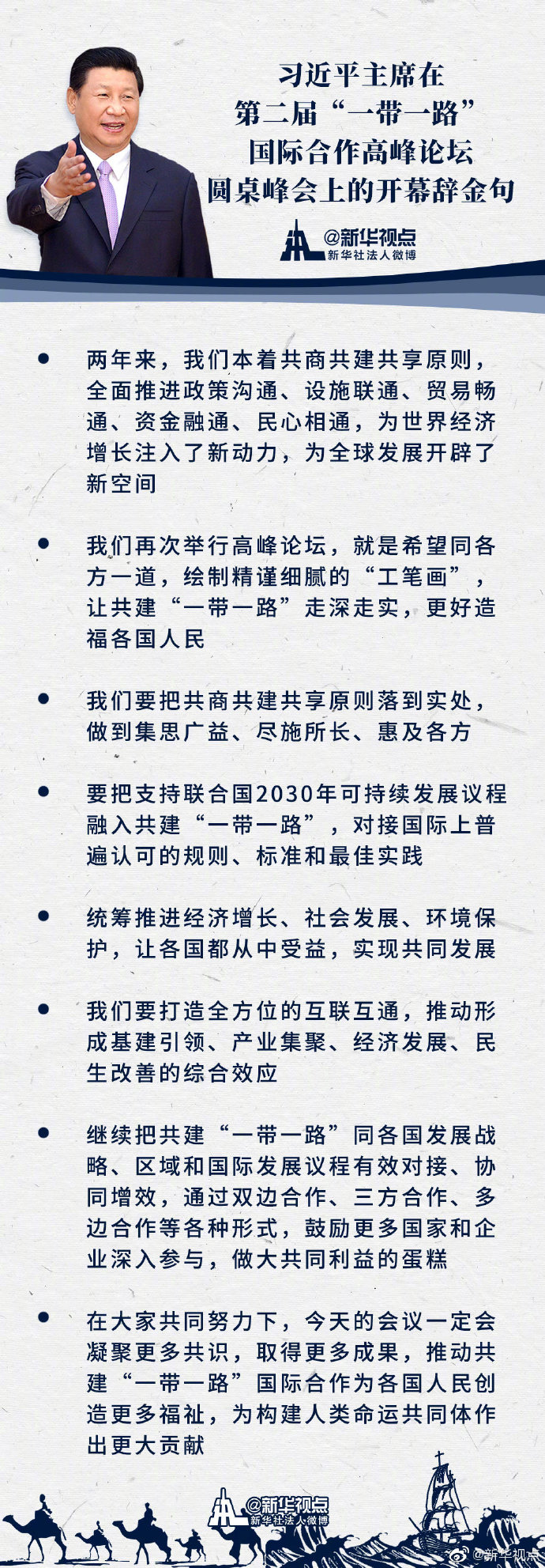 一圖速覽習(xí)近平主席在第二屆“一帶一路”國(guó)際合作高峰論壇圓桌峰會(huì)上的開(kāi)幕辭金句