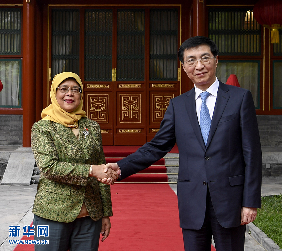 5月15日,中共中央政治局常委、中央書記處書記王滬寧在北京釣魚臺(tái)國(guó)賓館會(huì)見新加坡總統(tǒng)哈莉瑪。 新華社記者高潔攝