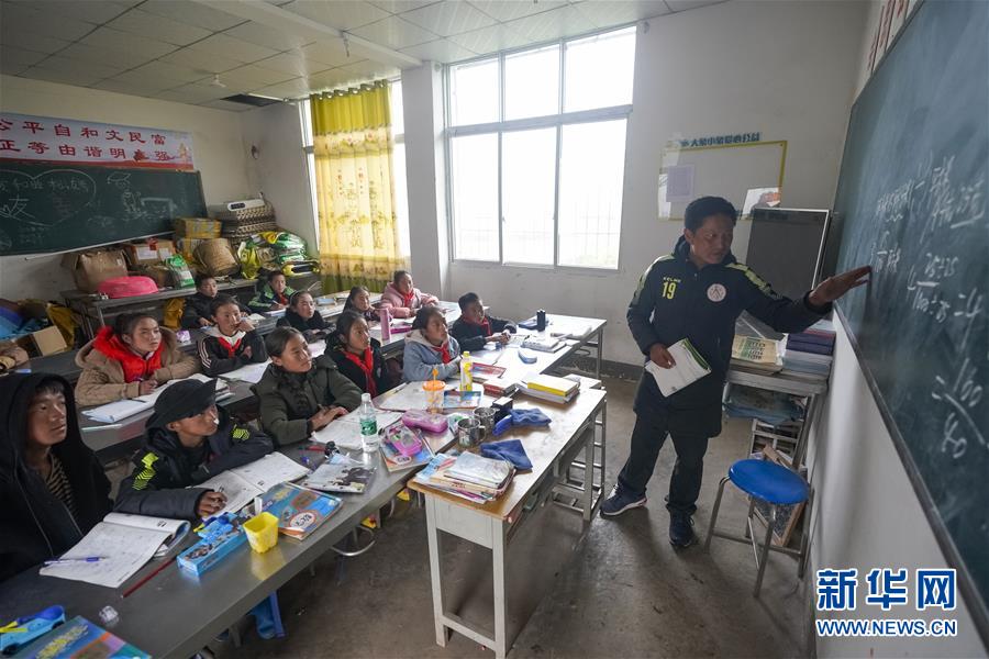 瓦吾小學(xué)教師曲比史古(右一)在給五年級(jí)學(xué)生上數(shù)學(xué)課(5月27日攝)。新華社記者 沈伯韓 攝