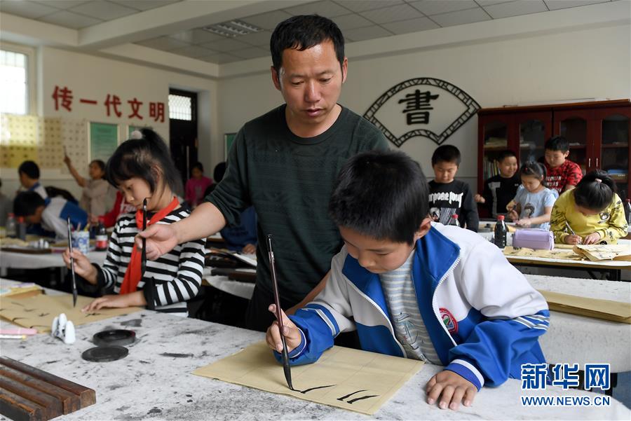 陜西省延安市楊家?guī)X福州希望小學(xué)書法社團(tuán)的學(xué)生在老師指導(dǎo)下練習(xí)書法(4月24日攝)。新華社記者 劉瀟 攝