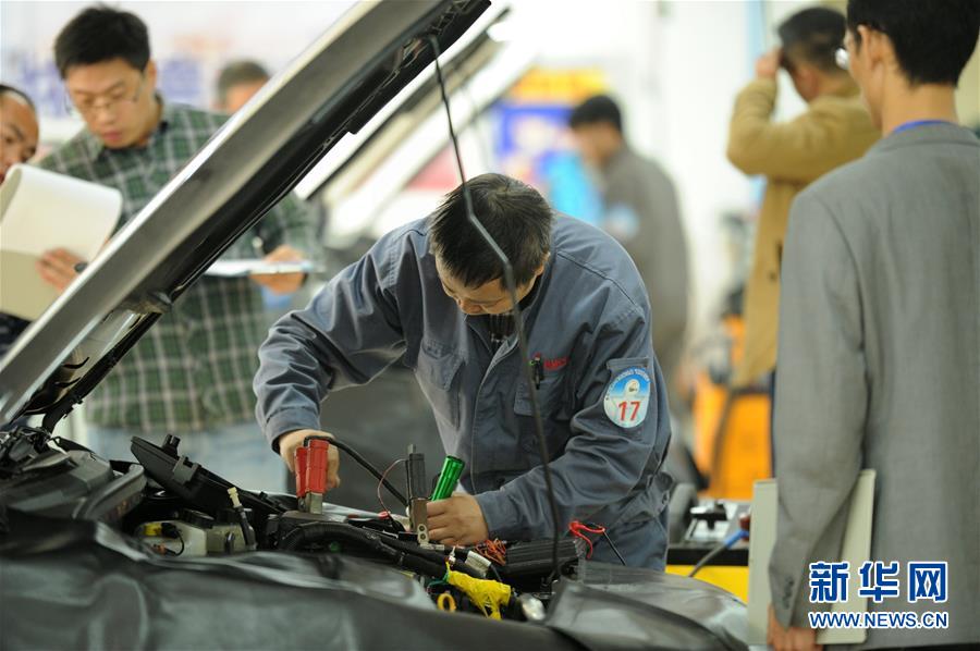 參賽選手在貴陽市第二屆技能之星競(jìng)技大賽決賽汽車維修項(xiàng)目比賽中(2015年11月17日攝)。大賽吸引5000余名來自貴州省中、高等職業(yè)院校的學(xué)生參加。新華社記者 陶亮 攝
