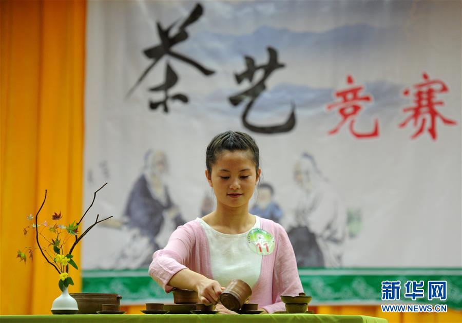 參賽選手在貴陽市第二屆技能之星競(jìng)技大賽決賽茶藝展示比賽中(2015年11月17日攝)。大賽吸引5000余名來自貴州省中、高等職業(yè)院校的學(xué)生參加。新華社記者 陶亮 攝