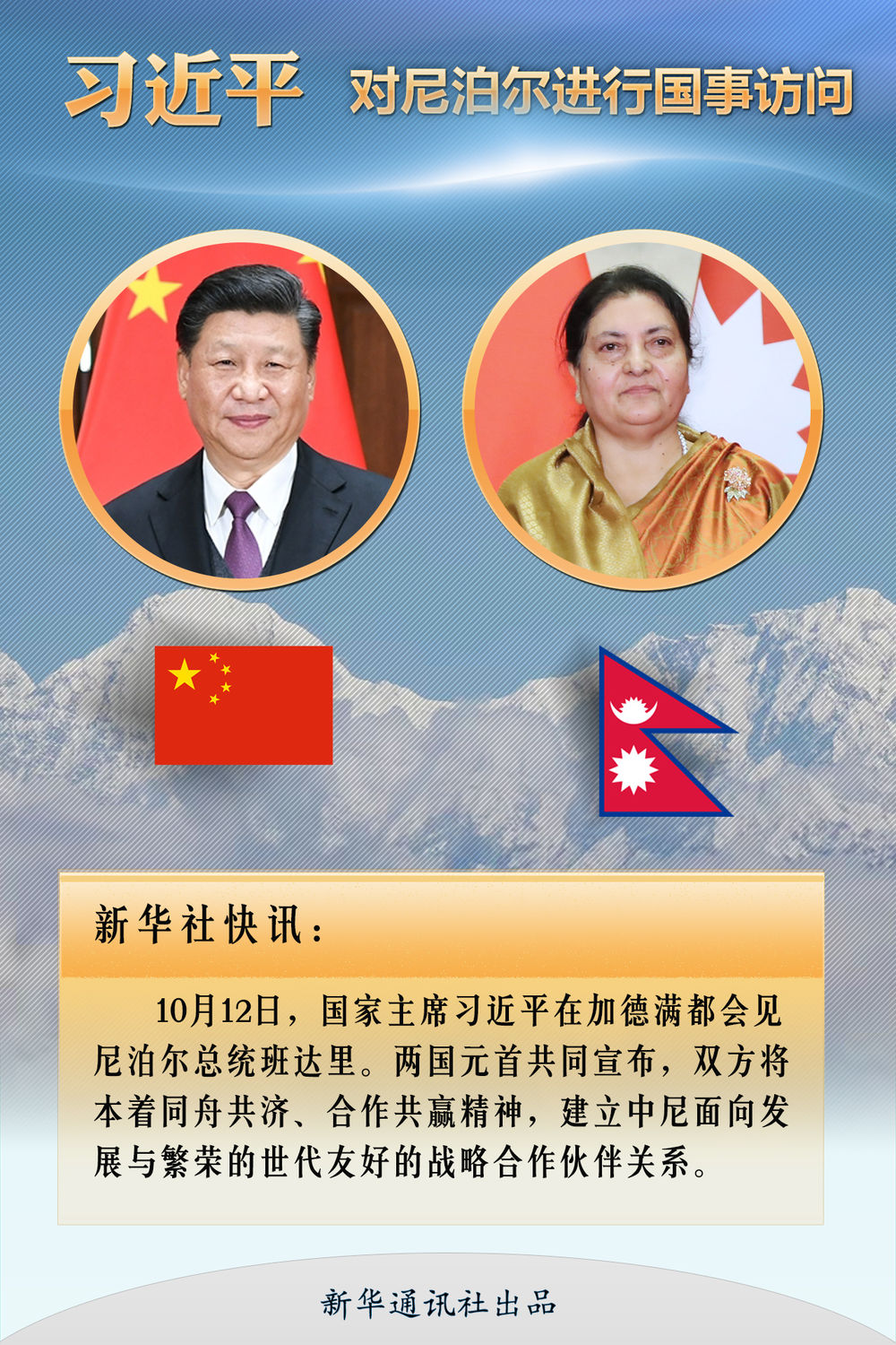 抵尼當(dāng)天,活動(dòng)滿滿當(dāng)當(dāng)。當(dāng)然,最大亮點(diǎn)還是中尼關(guān)系的新定位。當(dāng)天會(huì)見(jiàn)中,習(xí)近平主席同班達(dá)里總統(tǒng)共同宣布,雙方將本著同舟共濟(jì)、合作共贏精神,建立中尼面向發(fā)展與繁榮的世代友好的戰(zhàn)略合作伙伴關(guān)系。