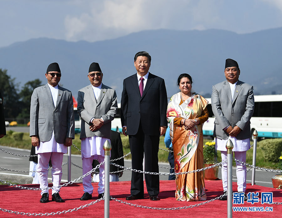 班達里在機場為習(xí)近平舉行隆重歡送儀式。尼泊爾副總統(tǒng)普恩、總理奧利、聯(lián)邦議會聯(lián)邦院主席蒂米爾西納、所有內(nèi)閣成員、軍方高級將領(lǐng)參加。