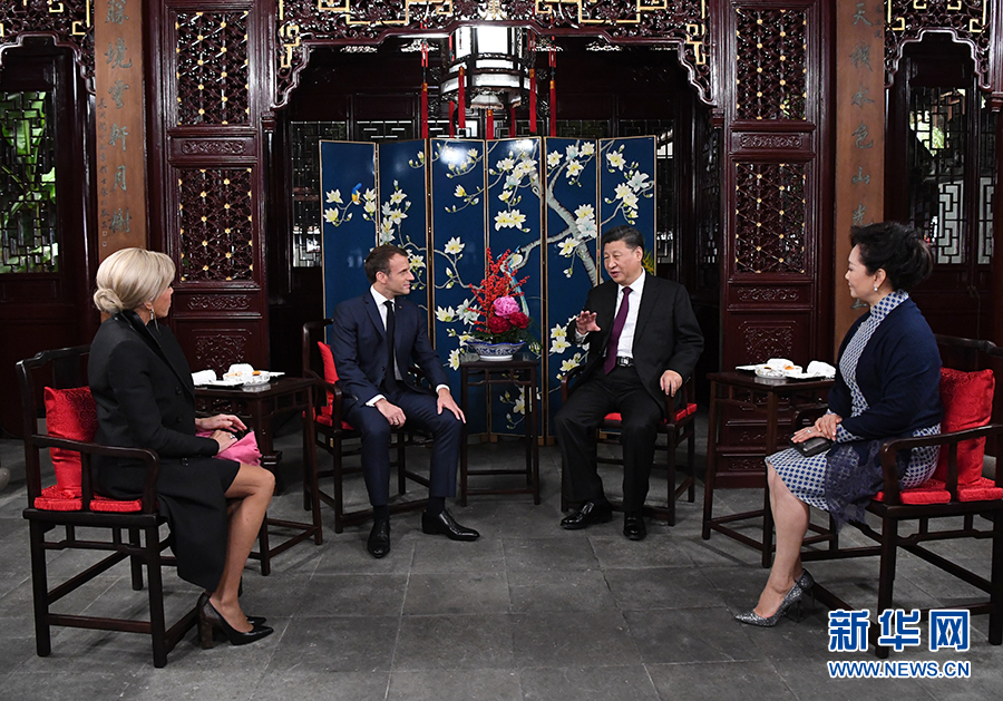 兩國元首夫婦在玉華堂落座。習(xí)近平和彭麗媛愉快地憶及今年3月訪問法國受到馬克龍夫婦熱情款待的情景。習(xí)近平說,歡迎馬克龍總統(tǒng)再次訪華并第一次來上海。上海是中國改革開放和發(fā)展進(jìn)步的縮影,體現(xiàn)了近代以來中國同世界關(guān)系的演變。希望這次訪問有助于你了解上海、了解中國。我和夫人選擇在豫園款待總統(tǒng)先生和夫人,希望你們能領(lǐng)略中華園林之美和中國的傳統(tǒng)文化。文化藝術(shù)表現(xiàn)形式不同,但帶給不同國家民眾的心靈體驗(yàn)是相通的,不同文化可以和諧共生。中法作為東西方兩大文明代表,應(yīng)該相互尊重,交流互鑒,各美其美,美美與共。