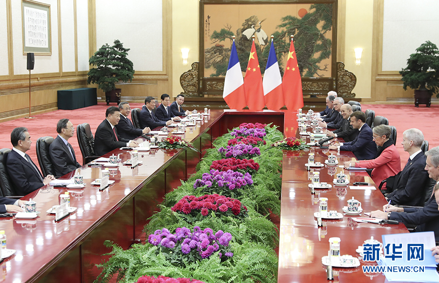 馬克龍表示,很高興在法中建交55周年之際再次訪華,我同習(xí)近平主席頻繁交往,深化了法中友誼和政治互信,有力推動了務(wù)實合作。我完全贊同習(xí)近平主席對深化法中合作提出的看法。法中在許多重大國際問題上持有相同立場,在當(dāng)前國際形勢下,法中作為兩個大國,負(fù)有特別重要的責(zé)任,法國加強同中國的對話和合作,具有重要示范作用。對雙方之間的一些分歧,法方愿本著相互尊重的精神妥善處理。法國企業(yè)熱切期待抓住中國擴大對外開放的契機,進一步進入中國市場,擴大對華農(nóng)產(chǎn)品出口,加強在航空、航天、民用核能等傳統(tǒng)領(lǐng)域合作,拓展科技創(chuàng)新、金融等領(lǐng)域合作。中方在法國發(fā)行歐元債券,這對法國具有重大意義。法方對中國企業(yè)赴法合作持開放態(tài)度,不會針對中國企業(yè)關(guān)上市場大門。法方愿推動“一帶一路”同歐盟歐亞互聯(lián)互通戰(zhàn)略對接,共建綠色“一帶一路”。法中要擴大人文交流,促進文明互鑒。法中要共同維護多邊主義,在反恐、伊朗核等問題上加強戰(zhàn)略溝通協(xié)調(diào),推動世貿(mào)組織改革早日取得進展。法中將共同發(fā)表《法中生物多樣性保護和氣候變化北京倡議》,兩國可以在這些重要問題上發(fā)揮引領(lǐng)作用。在當(dāng)前充滿不確定性的世界里,歐盟深化對華合作至關(guān)重要,法方愿推動歐中關(guān)系深入發(fā)展,加快歐中投資協(xié)定談判進程。
