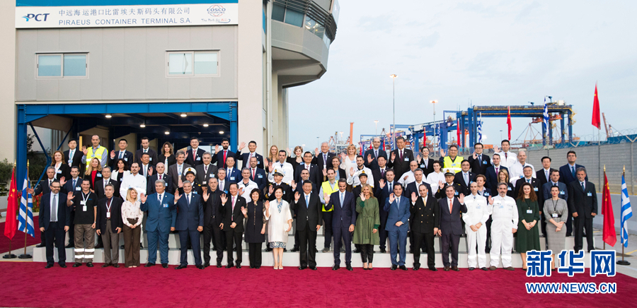 當(dāng)?shù)貢r(shí)間11月11日,國(guó)家主席習(xí)近平和夫人彭麗媛在希臘總理米佐塔基斯夫婦陪同下,共同參觀中遠(yuǎn)海運(yùn)比雷埃夫斯港項(xiàng)目。這是習(xí)近平和米佐塔基斯同中遠(yuǎn)當(dāng)?shù)貑T工代表等合影。 新華社記者 謝環(huán)馳 攝