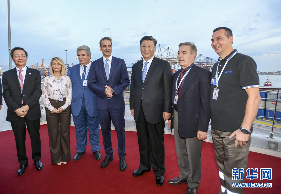 當(dāng)?shù)貢r(shí)間11月11日,國(guó)家主席習(xí)近平和夫人彭麗媛在希臘總理米佐塔基斯夫婦陪同下,共同參觀中遠(yuǎn)海運(yùn)比雷埃夫斯港項(xiàng)目。這是習(xí)近平和米佐塔基斯同中遠(yuǎn)當(dāng)?shù)貑T工代表等合影。 新華社記者 謝環(huán)馳 攝