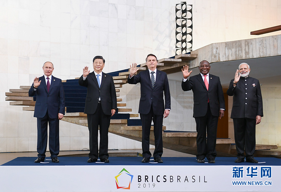 當?shù)貢r間11月14日,金磚國家領導人第十一次會晤在巴西首都巴西利亞舉行。巴西總統(tǒng)博索納羅主持會晤。中國國家主席習近平、俄羅斯總統(tǒng)普京、印度總理莫迪、南非總統(tǒng)拉馬福薩出席。這是五國領導人合影。 新華社記者 謝環(huán)馳 攝