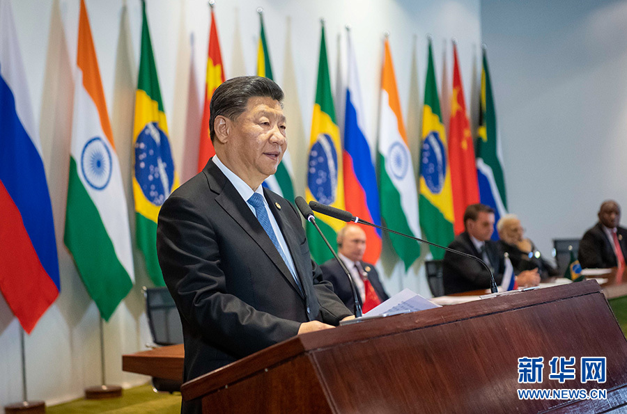 當?shù)貢r間11月14日,金磚國家領導人同金磚國家工商理事會和新開發(fā)銀行對話會在巴西利亞舉行。中國國家主席習近平、巴西總統(tǒng)博索納羅、俄羅斯總統(tǒng)普京、印度總理莫迪、南非總統(tǒng)拉馬福薩共同出席。這是習近平發(fā)表講話。 新華社記者 李學仁 攝